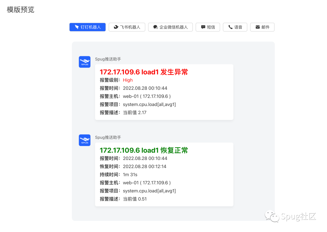 Spug推送助手针对常见的报警系统,内置好了很多报警模版,可以让用户简单快捷的配置常见的报警通知,下面以Zabbix为例,看一下如何快速配置电话、短信、邮件、钉钉、飞书、企业微信等报警通知。