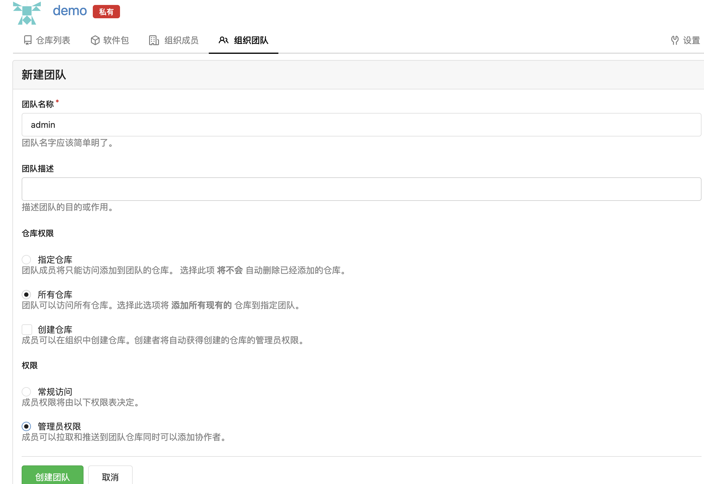 在团队页面,将刚创建的用户添加进来,它就拥有了对组织内所有仓库的管理权限。