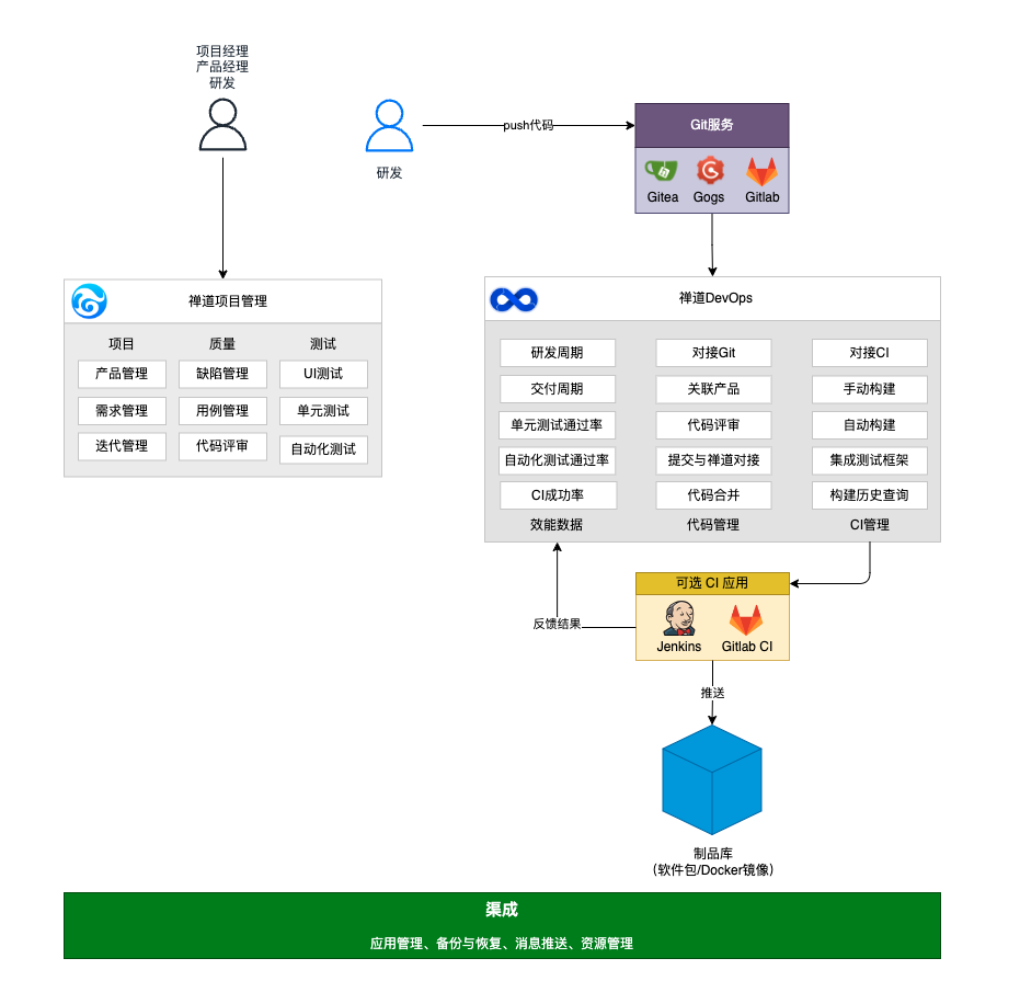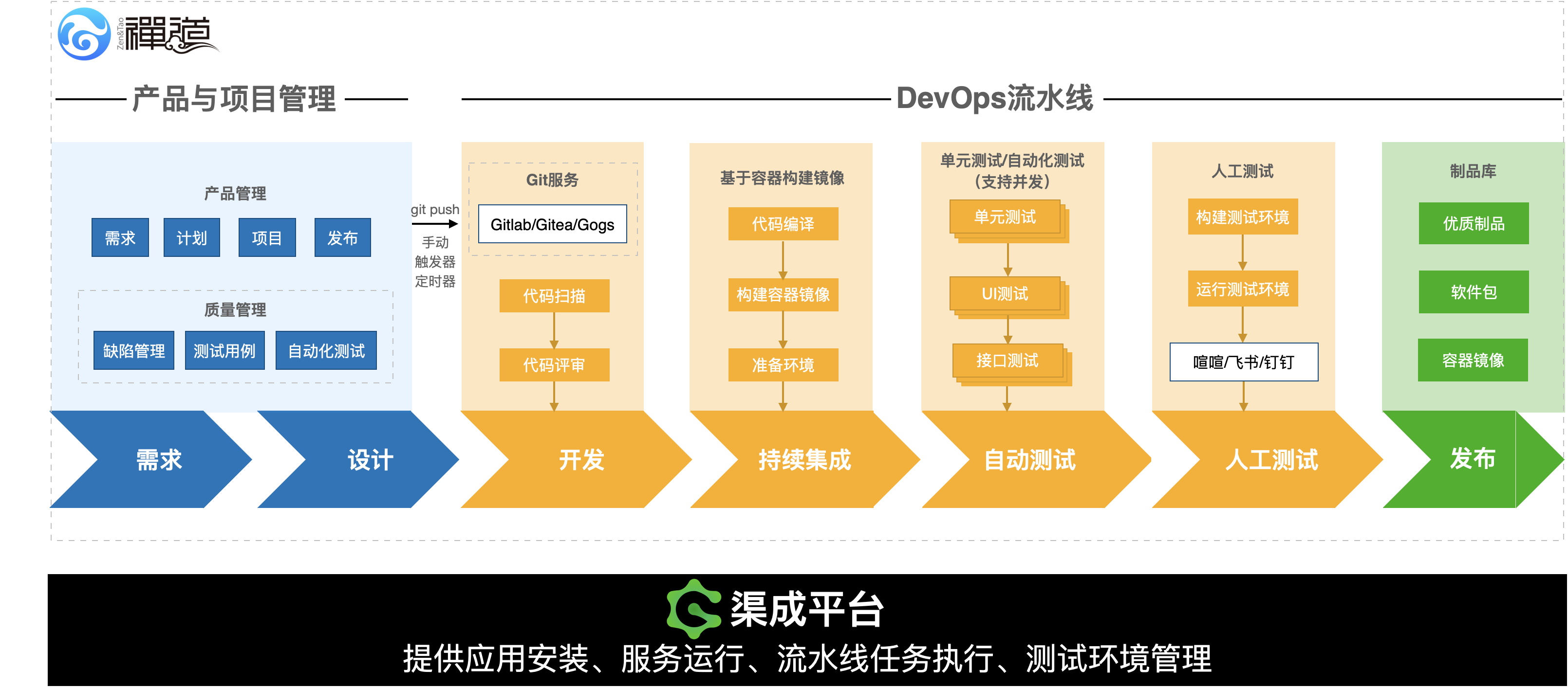 渠成 DevOps 平台企业版1.0 正式发布,这是一套基于开源软件的 DevOps 平台。它包含禅道项目管理软件、 GitLab、Gitea、Jenkins 、SonarQube 等组件,能够实现从需求管理到代码托管,从持续集成到持续交付,从质量检测到自动化测试等完整的 DevOps 流程。