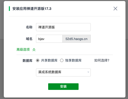 在安装应用时可以指定应用安装所使用的数据库,平台默认已经内置了全局共享数据库,使用共享数据库可以节省集群资源;也可以根据需要选用独享数据库,选用独享数据库时应用安装后会有一个专属的数据库实例可以使用。