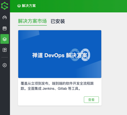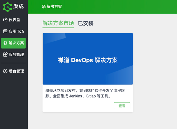 新增“解决方案”市场,并上架了禅道 DevOps 解决方案。渠成平台会陆续上架更多的解决方案,您可以通过解决方案市场找到适合自己使用场景的解决方案,并且一键安装。
